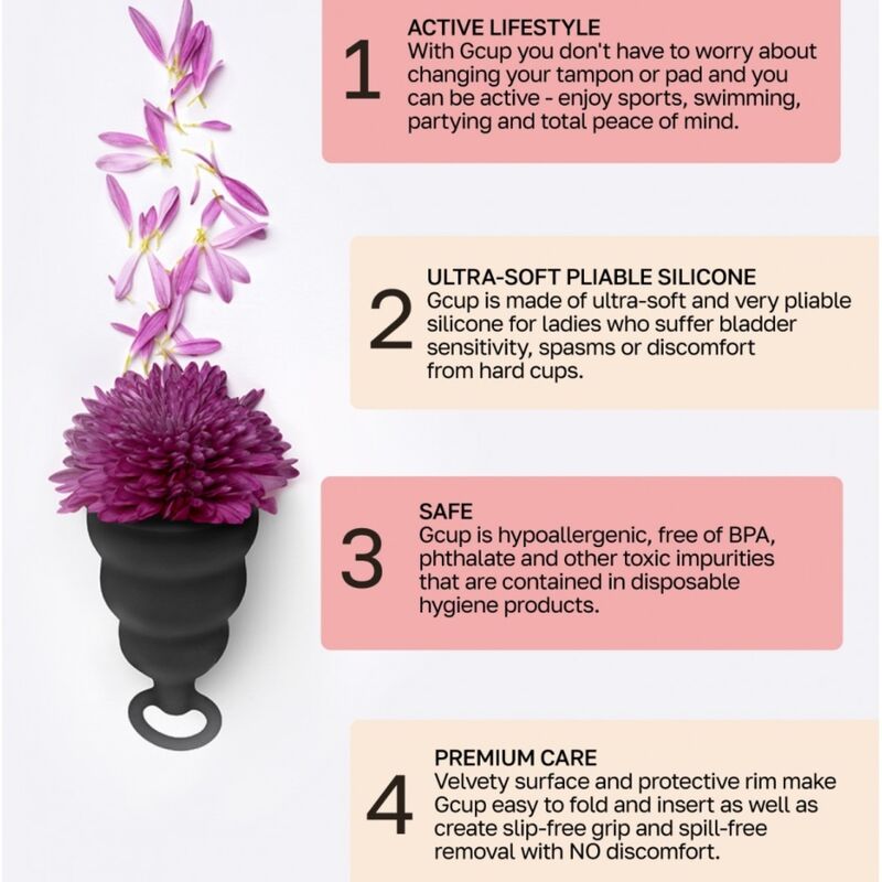 Менструалната чашка Gcup е с форма на камбана. Основното предимство на Gcup е вътрешният възвратен клапан. Благодарение на клапана, течността не се връща във влагалището по време на активен начин на живот. Можете да извършвате ежедневните си дейности, спортувате и дори плувате, напълно забравяйки за „тези дни“. Gcup има мека и гладка повърхност, с перфектния размер, така че да не ви се иска. Освен това, чашките ще спестят значително количество в сравнение с конвенционалните превръзки и тампони. Менструалната чашка Gcup е абсолютно безопасна за женското здраве.